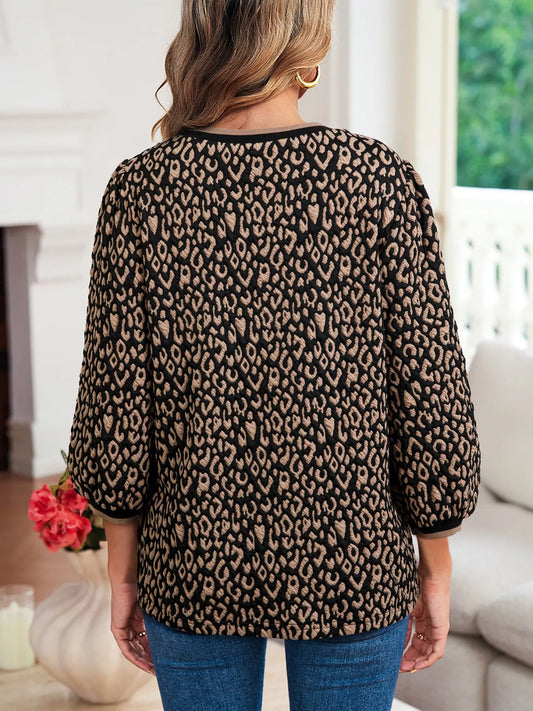 Leopard Print Puffy Bracelet Sleeve Contrast Trim Round Neck Top